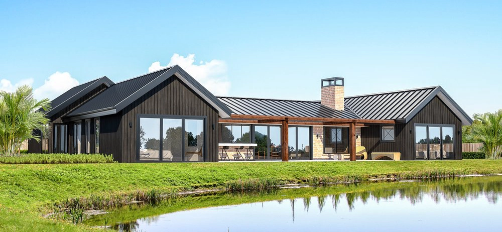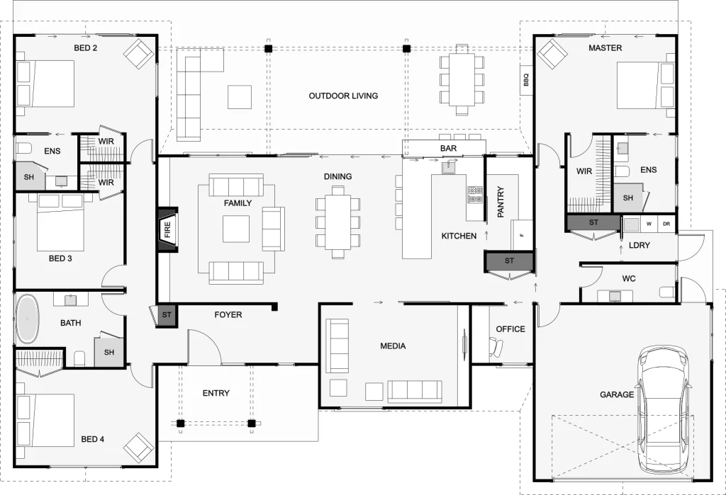 An open-plan living and dining area that continues out to the alfresco area with outdoor dining and a bar. A master suite at one end of the home and a secondary master suit at the opposite, both with built-in wardrobes and ensuites.