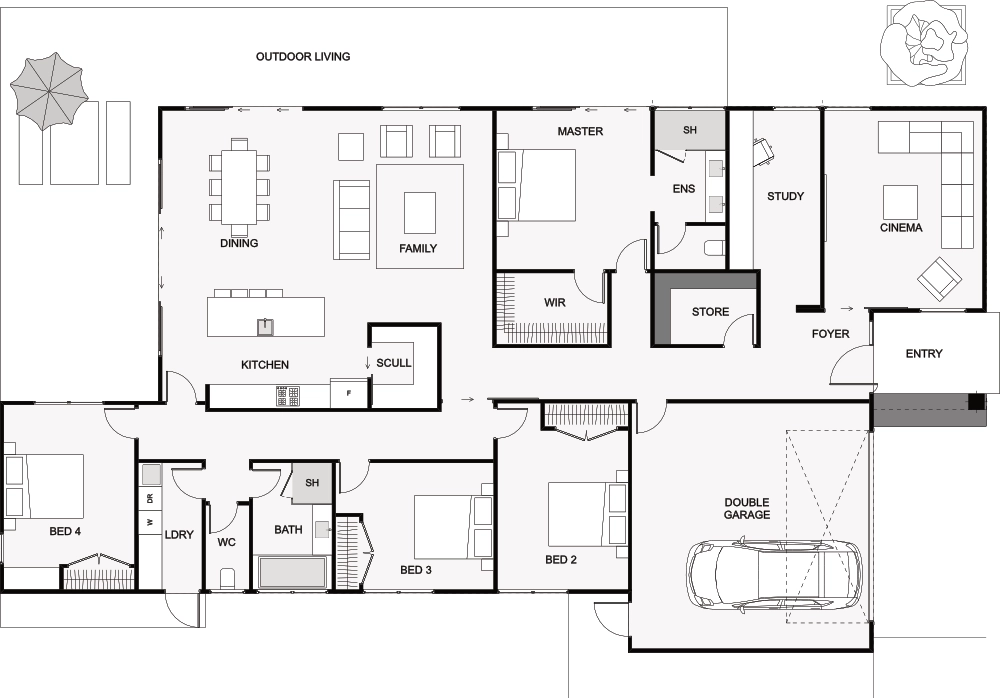 This home has two living spaces, each at opposite ends of the house. A large study, close to the entry as well as a large laundry, scullery and a living space which flows out to the outdoor living.