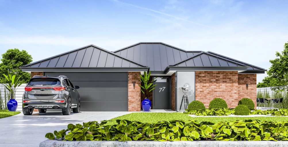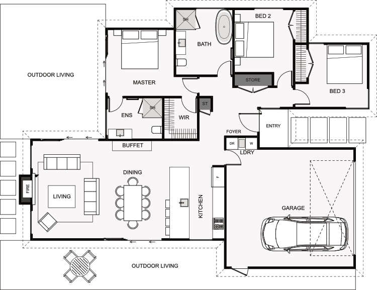 Designed with two main wings around dual outdoor living spaces, this home’s design is well thought out. All bedrooms are positioned for morning sun. The master also enjoys a shared outdoor space. The open plan living room has the option of a pitched ceiling and this space flows out to both morning and evening outdoor living areas.